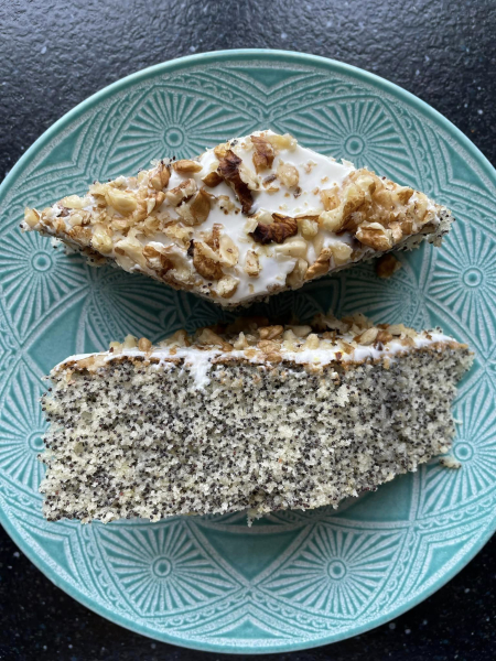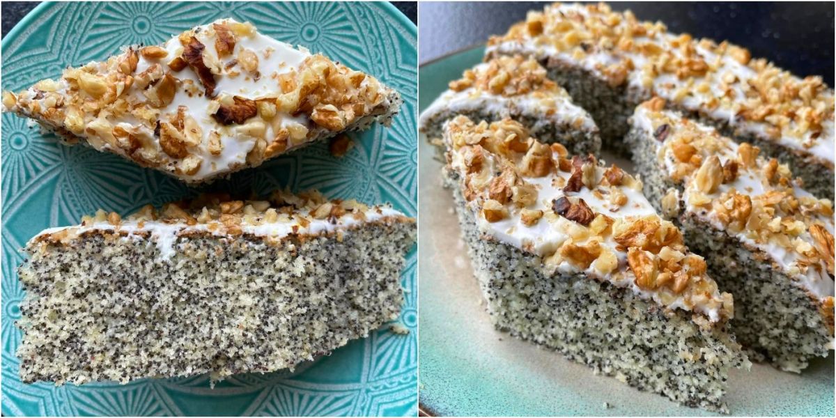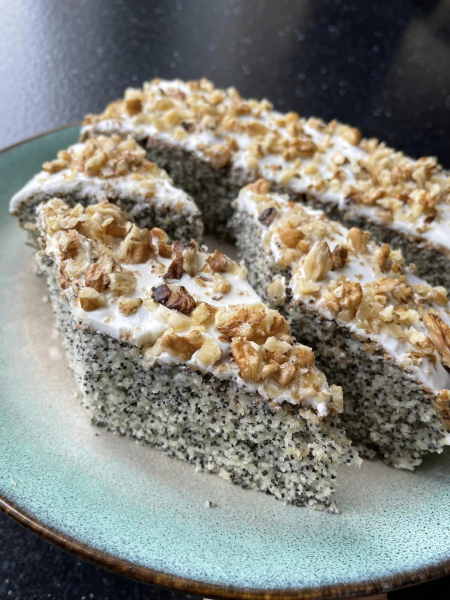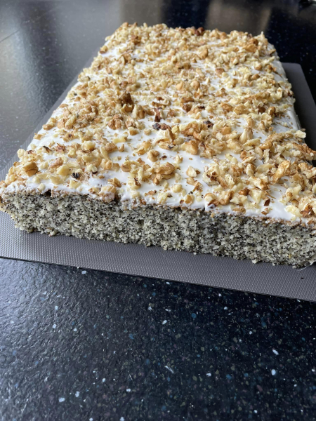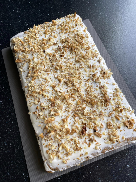 Змішуємо сметану, пудру і ванільний цукор і змащуємо пиріг. Посипаємо горішками.