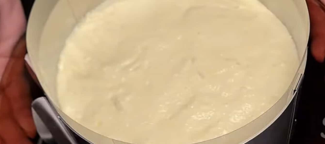 Виливаємо суміш на основу торта. Вирівнюємо та поміщаємо в холодильник на 30 хвилин.