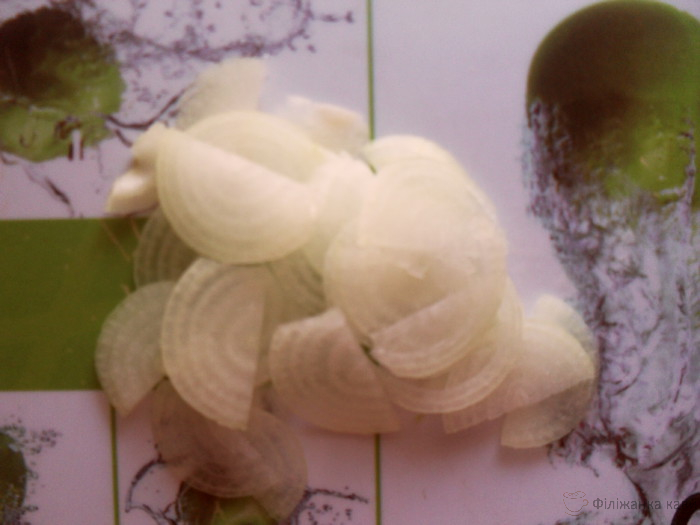 Далі поріжте цибулю півкільцями.