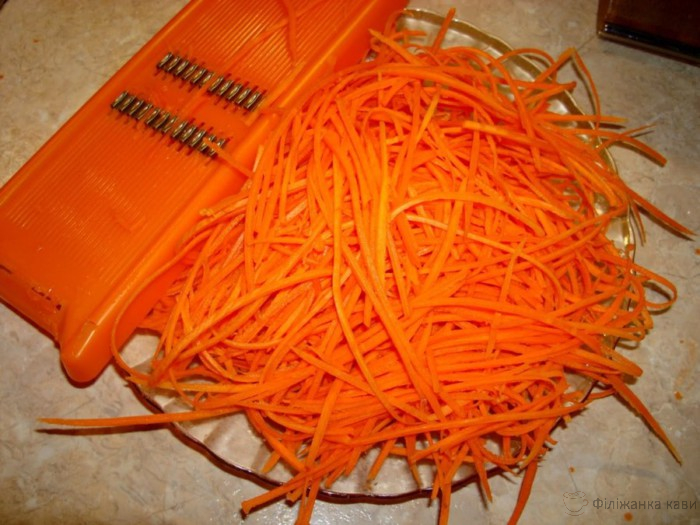 Тепер треба потерти моркву на тертці, яка використовується для моркви по-корейськи. Можна взяти і звичайну, якщо такої нема. Зміниться лише зовнішній вигляд.