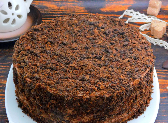 Обрізки коржів підсушити на сковорідці та подрібнити у крупну крихту. Посипати верх та боковинки, наш шоколадний торт на сковороді готовий, смачного чаювання Вам!.