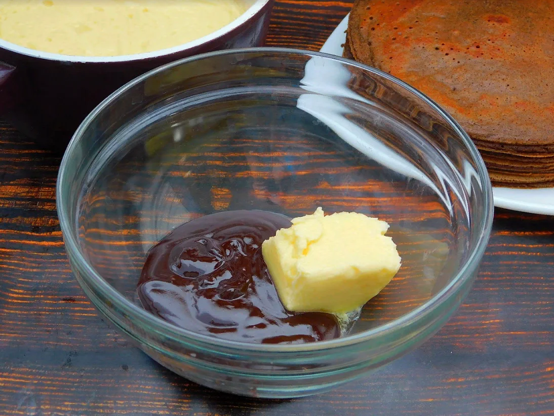 - Тепер можна продовжити робити крем. У миску викласти м’яке вершкове масло і розтоплений шоколад.