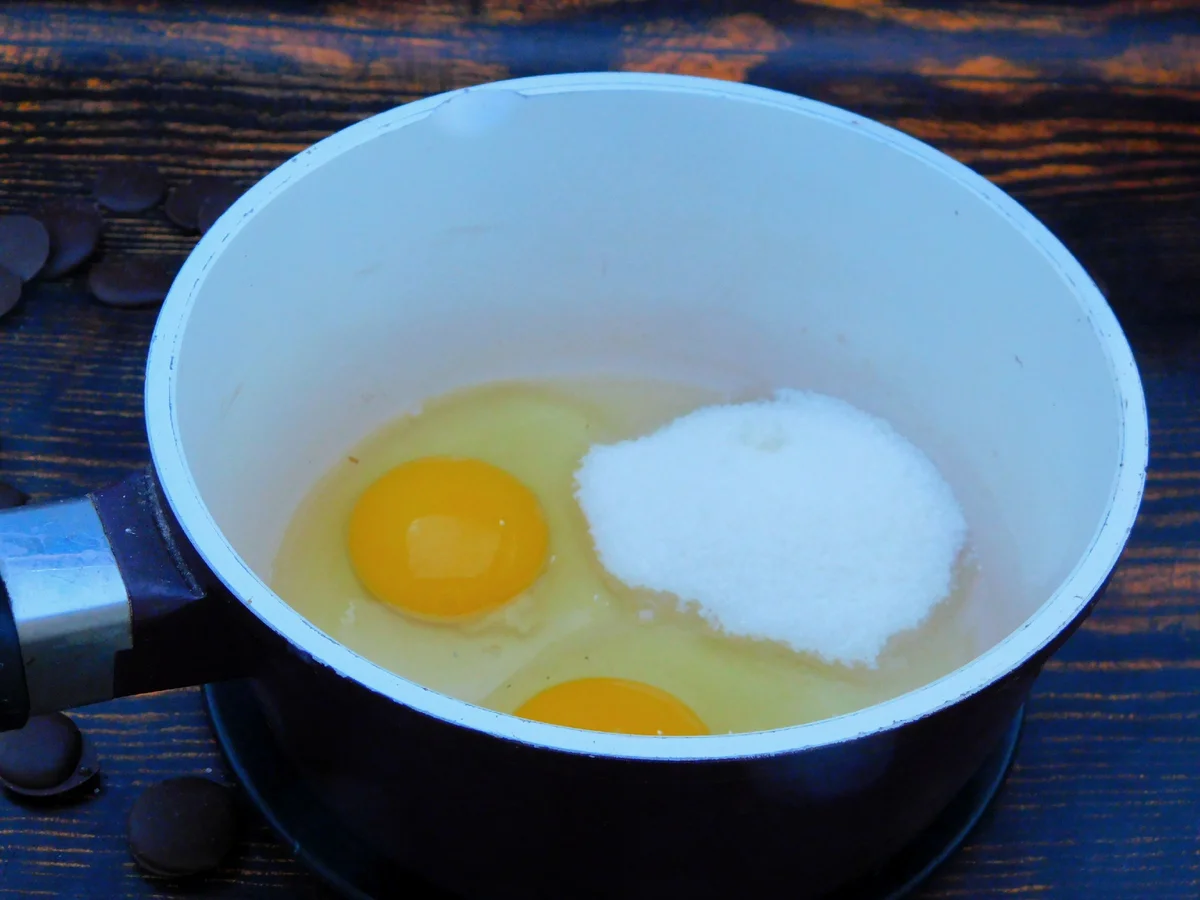 - Для крему в сотейник розбити яйця, всипати цукор.