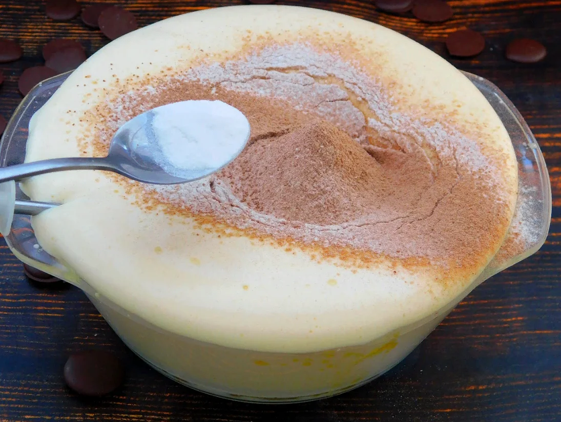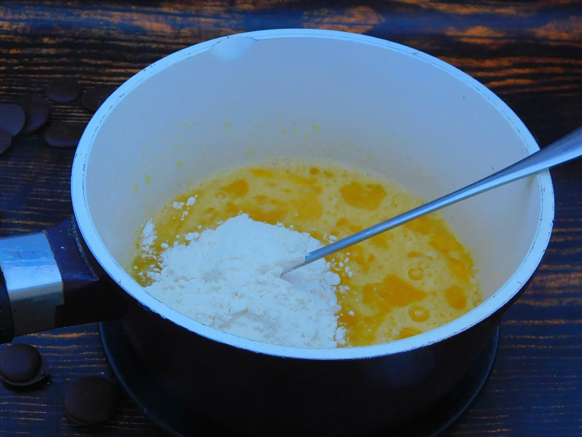 - Збити міксером до пишної піни та збільшення обсягом в 3 рази. Влити розтоплене вершкове масло та молоко.
