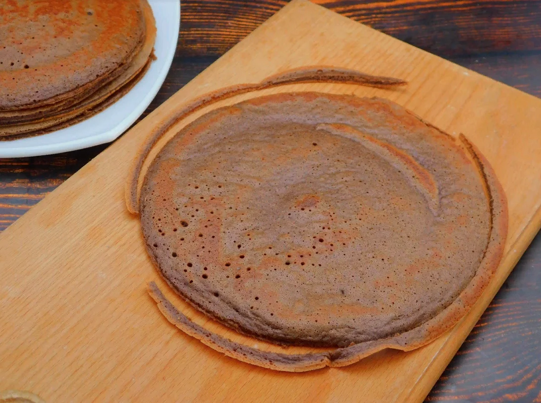 - Сковороду змастити олією лише перед випіканням першого коржа. Розігріти і налити два половники тіста (діаметр сковороди 20 сантиметрів). Маса вільно розтікається по сковорідці.