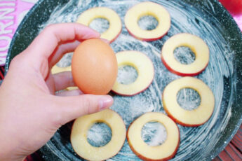 - А в цей час зайнятися випіканням коржів. У миску розбити яйця, всипати цукор.