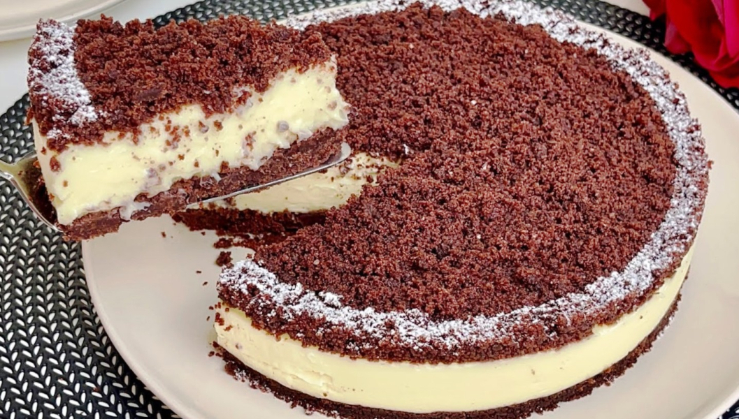 Посипаємо другою частиною бісквіту кремовий шар, залишаємо торт стабілізуватися 4 години у холодильнику.