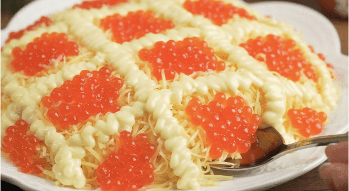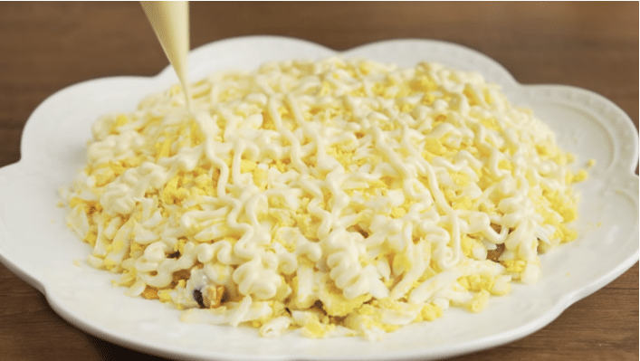 - Варені яйця натираємо на крупній тертці, сир натираємо на дрібній тертці. На морепродуктах малюємо тонку сіточку з майонезу.