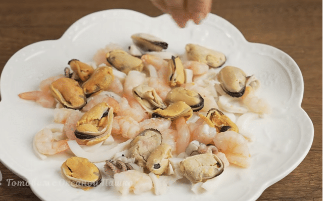 Морепродукти взяти на свій смак. Можна купити готовий морський коктейль, або замінити їх червоною рибою.