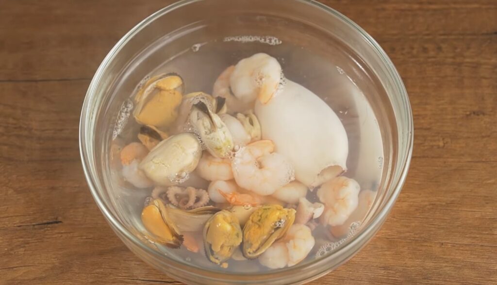 - Розморожені і очищені морепродукти заливаємо окропом на одну хвилину. Потім зливаємо воду і повторюємо процедуру три рази поспіль.