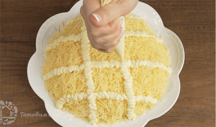 - Посипаємо тертим сиром. Наносимо сітку з майонезу великими смужками.