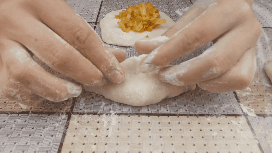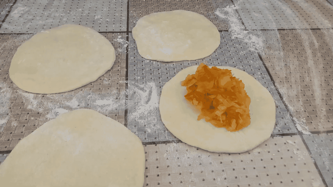 Далі колобки розгортаємо качалкою в невеликі коржики. У середину кладемо 1 -2 ст.л. начинки.