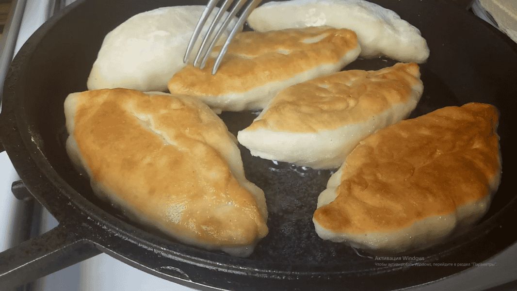 Смажимо пиріжки в розпеченій олії на вогні нижче середнього. Викладаємо пиріжки в сковороду швом вниз, попередньо струшуємо з них борошно. Під час смаження тісто добре піднімається. Як зарум’янилася одна сторона, перевертаємо на іншу.
