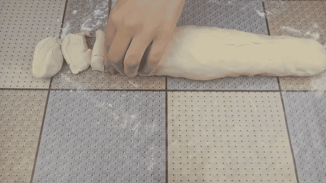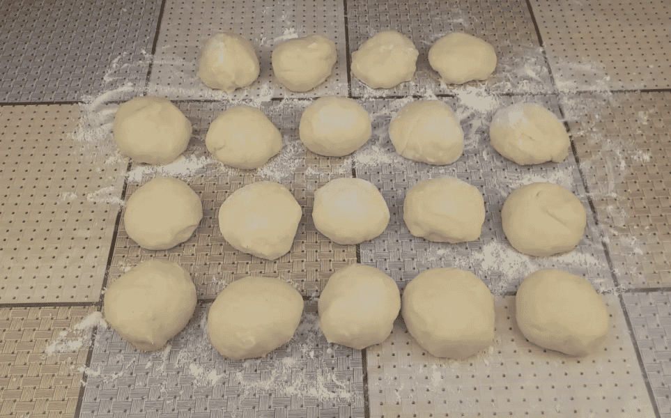 Стіл припиляємо борошном, з тіста катаємо джгут і ділимо його на рівні шматочки. У мене вийшло 19 шт вагою по 40 г.