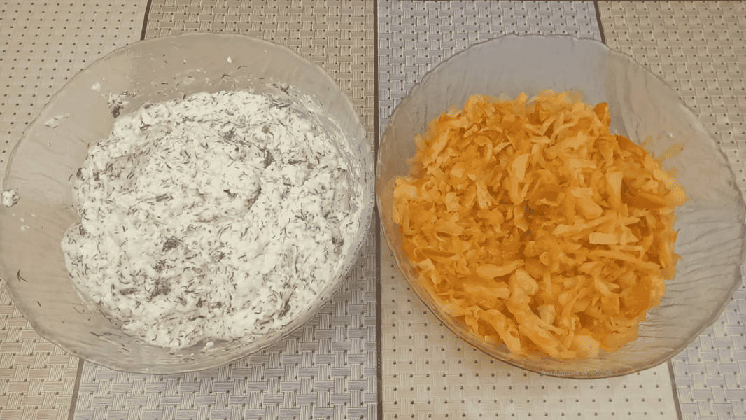 Отримане тісто накриваємо кухонним рушником і залишаємо відпочити, поки приготуємо начинку. Я формуватиму пиріжки відразу, оскільки заздалегідь приготувала начинку. Це солоний сир із кропом та яйцем та тушкована капуста з цибулею.