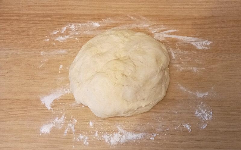 Тісто до цього часу трохи піднялося, стало ніжним і еластичним. Посипаю стіл невеликою кількістю борошна і починаю його вимішувати.