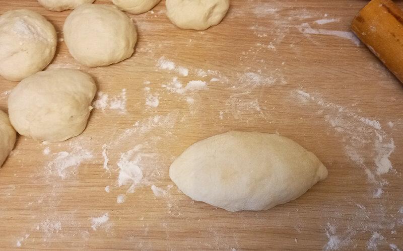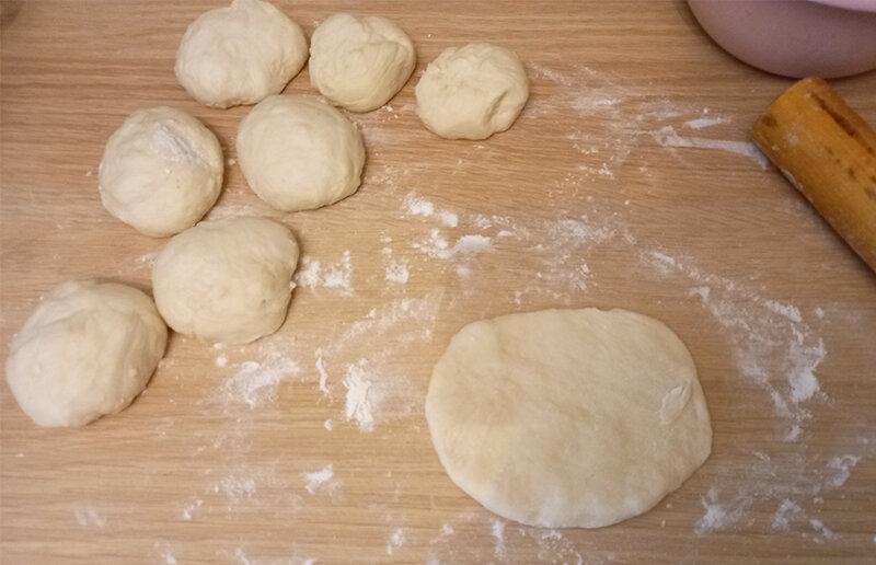 З шматка тіста формую товстий джгут, ділю його на 8 частин. Кожен шматок скочую в кулю. Потім кожну кульку розкочую в невеликий круглий корж.