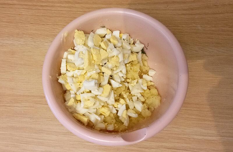 Рубані яйця викладаю в миску з картоплею і перемішую, рівномірно розподіляючи у всій масі.