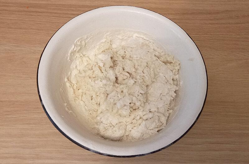 Змішую опару з борошном і сіллю. Вимішувати тісто не потрібно, а тільки все перемішати. Маса виходить середньої густоти.