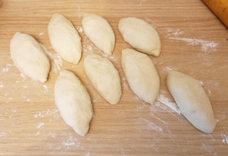 У мене вийшло вісім пузатих пиріжків. Я поклала їх швом вниз, щоб тісто скріпилося ще щільніше. Залишила їх на 5 -10 хвилин трохи піднятися (хоча це і не обов’язково). Після цього можна приступати до смаження.