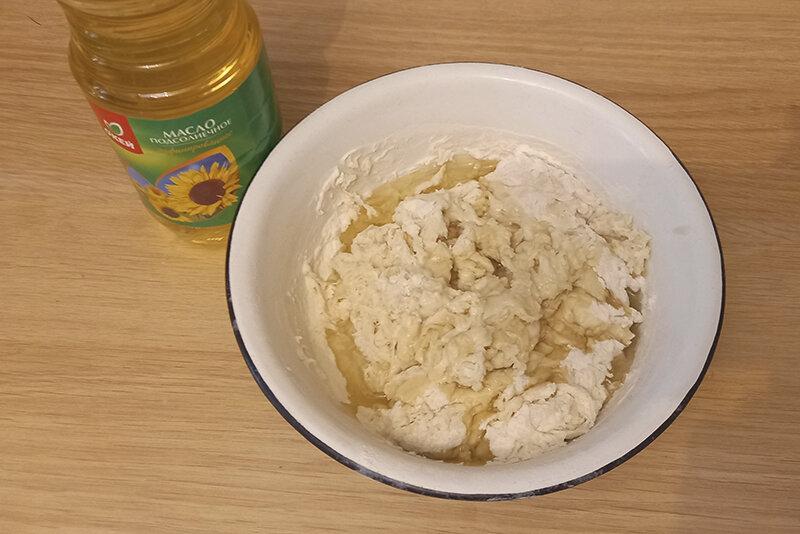 У борошняну заготівлю вливаю олію. Воно робить тісто еластичним і податливим. Руками активно вмішую його в масу.