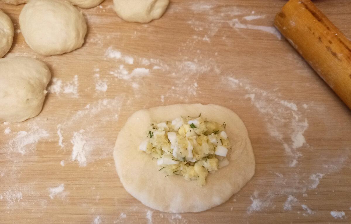 Я наліпила вісім великих заготовок. Подобається мені все велике. Але, якщо ви любитель невеликих за розміром пиріжечків, то із запропонованої кількості інгредієнтів вийде 10-12 штук. Якщо не додавати в начинку яйця і вершкове масло і замінити їх смаженою цибулею, то такою випічкою можна побалувати себе і в піст.