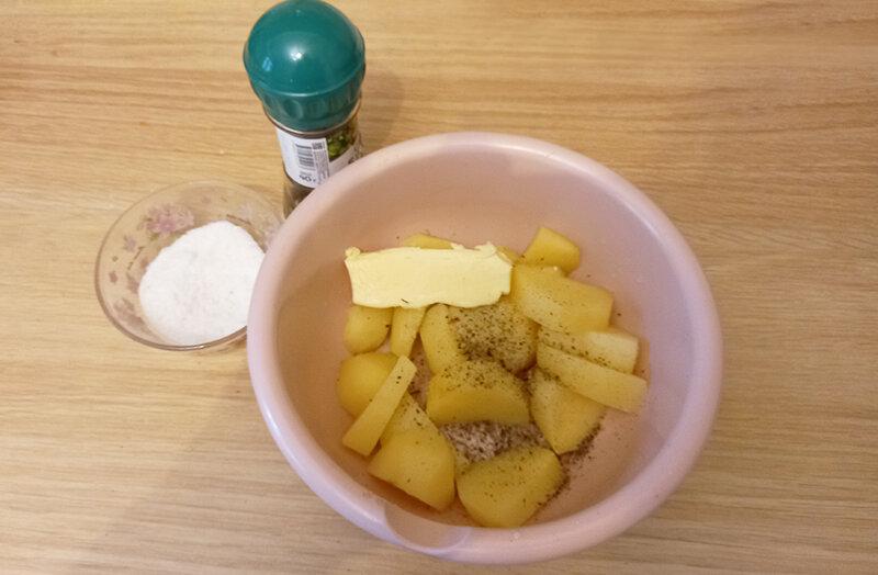 А поки приготую начинку. У миску розміщую гарячу зварену картоплю, всипаю сіль і суміш перців. Кладу вершкове масло. Толкушкою перетворюю в круте пюре.