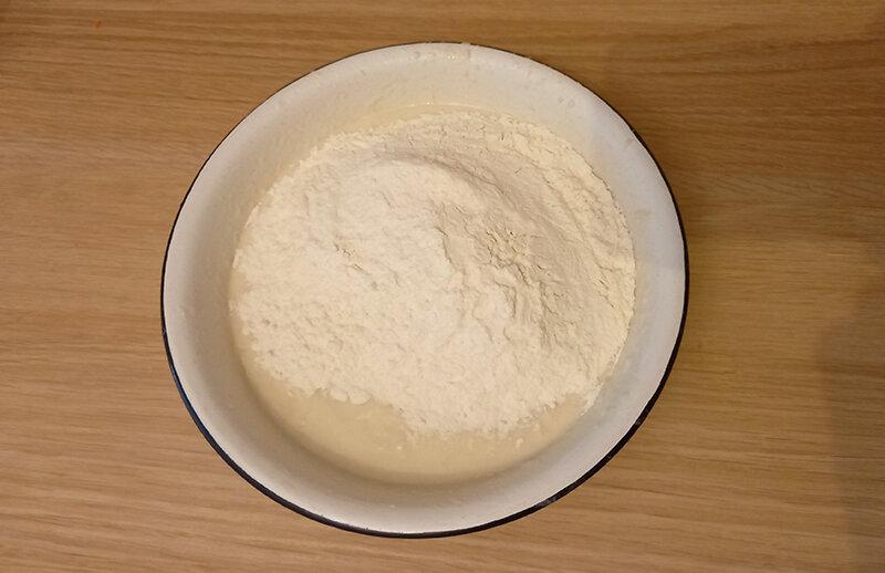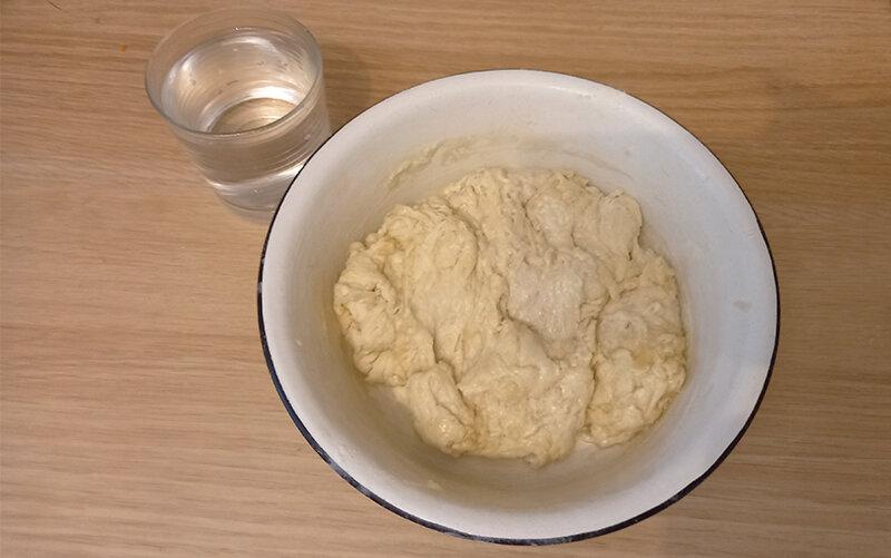 Вливаю в тісто 200 мл теплої кип’яченої води. Злегка вмішую рідину в борошняну масу.