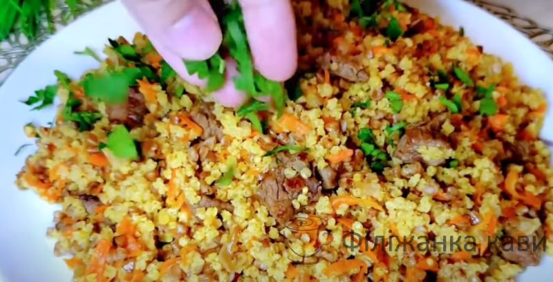 В результаті у нас виходять смачні коржі з тушкованим м’ясом у гречці та пшоні.