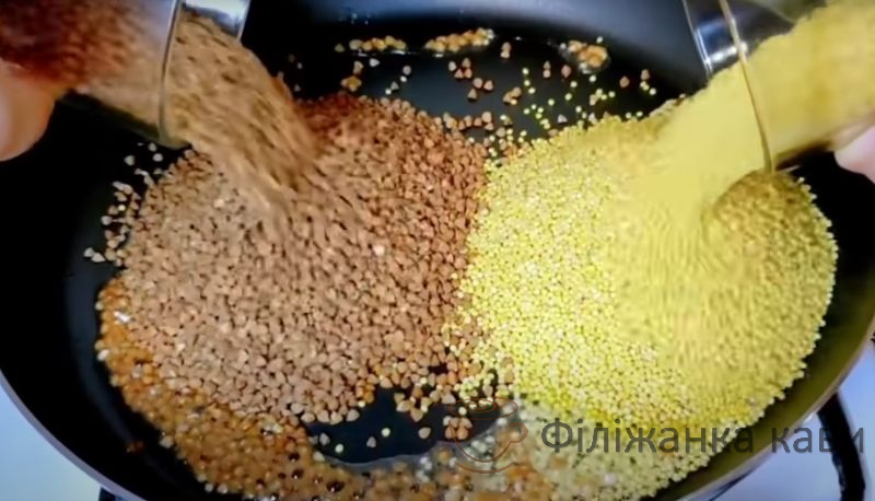 Пшоно та гречку обсмажуємо на розпеченій олії протягом 10 хвилин на середньому вогні.