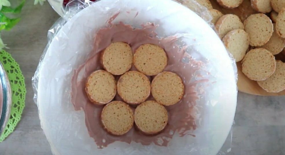 Глибоку напівкруглу тарілку ( салатник ) застеляємо харчовою плівкою. На дно викладаємо трохи крему і злегка його розмазуємо. Потім викладаємо шар з пряників.