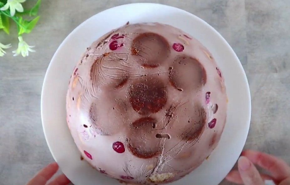 Перевертаємо ємність і виймаємо тортик. знімаємо плівку