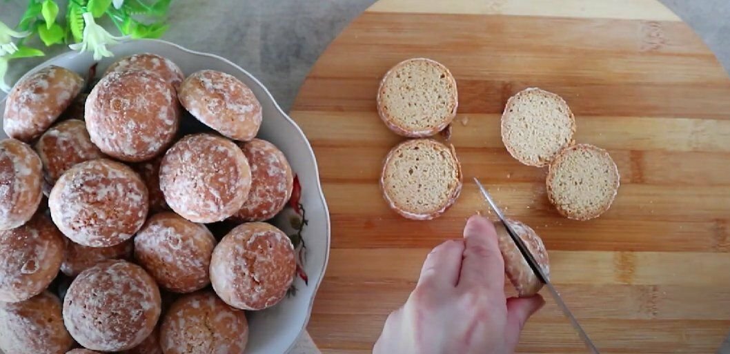 Пряники ( прості, без добавок ) розрізаємо навпіл. Вони стануть основою для нашого торта.
