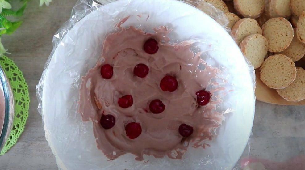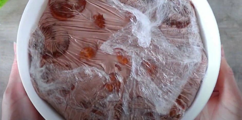 Готовий тортик прикриваємо харчовою плівкою і відправляємо в холодильник на 4 години.