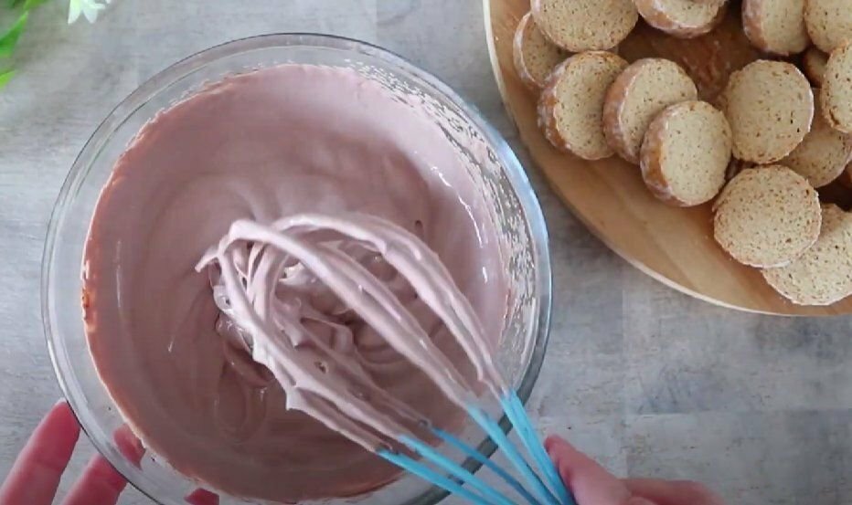 Приготуємо крем. У сметану додаємо цукрову пудру, ванілін і какао. Ретельно перемішуємо масу вінчиком до однорідного кольору.