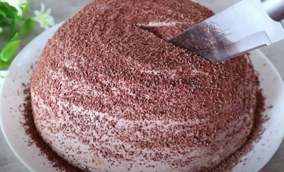 Промазуємо поверхню залишками крему і посипаємо тертим шоколадом або какао.