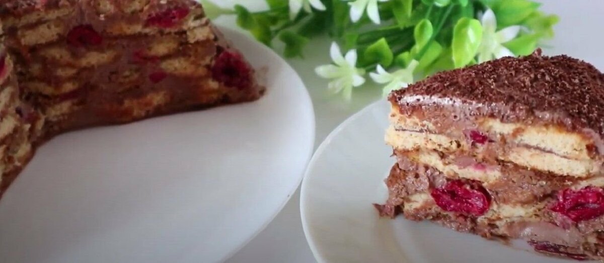 Для додання торту смакового відтінку візьмемо ягоди вишні. Таким чином, викладаємо кілька шарів, поки не закінчаться всі продукти ( крему, потрібно залишити пару ложок )