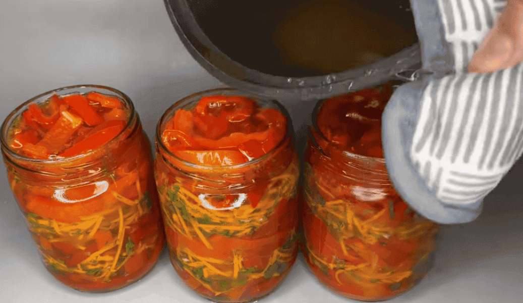 7. Маринад, що залишився після варіння, акуратно розлити в баночки з перцем і накриваємо банки кришками.