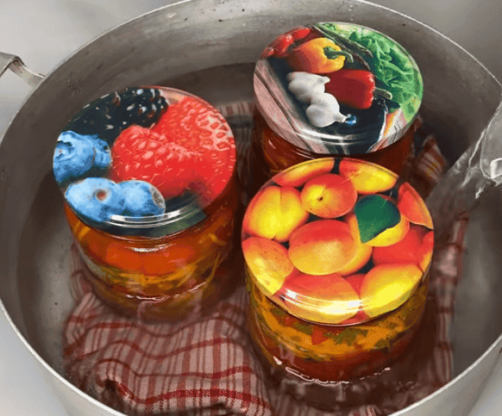 8. На дно глибокої каструлі стелимо рушник і встановлюємо баночки накриті кришками. Вливаємо в каструлю теплу воду до плічок банок, ставимо на вогонь і з моменту закипання стерилізуємо 7 хвилин. Потім дістаємо банки і щільно закручуємо кришками. Зберігається така закуска за кімнатної температури.