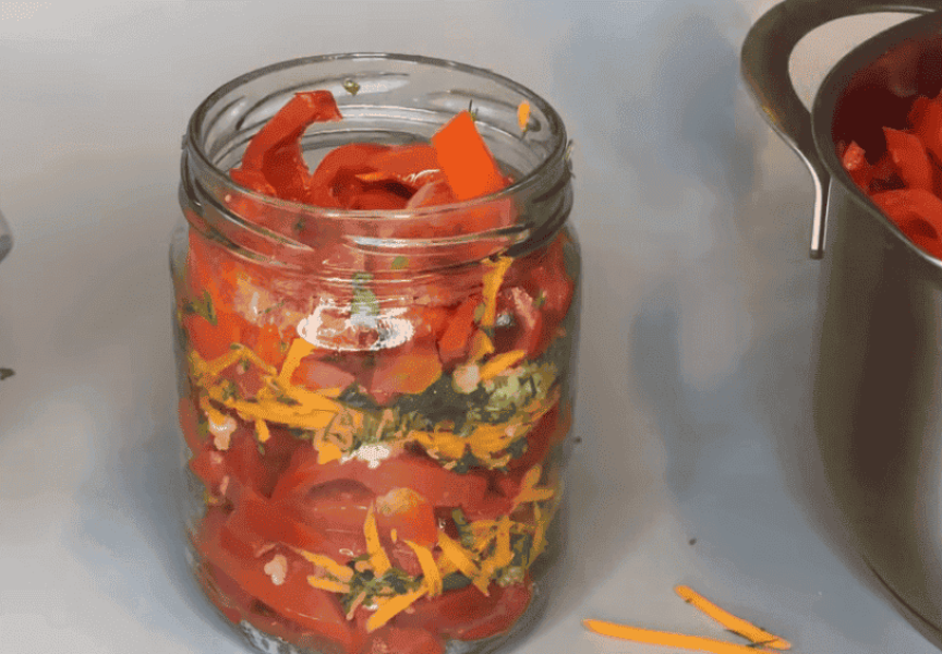 6. По чистих баночках розкладаємо перець, перешаровуючи подрібненим часником, морквою та зеленню.