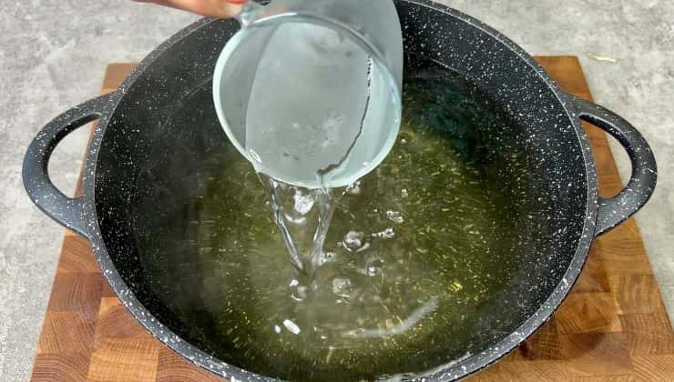 6. Через півгодини зливаємо воду, всипаємо цукор, ставимо на плиту, доводимо до кипіння, потім вливаємо 9% оцет, перемішуємо та знімаємо з вогню.