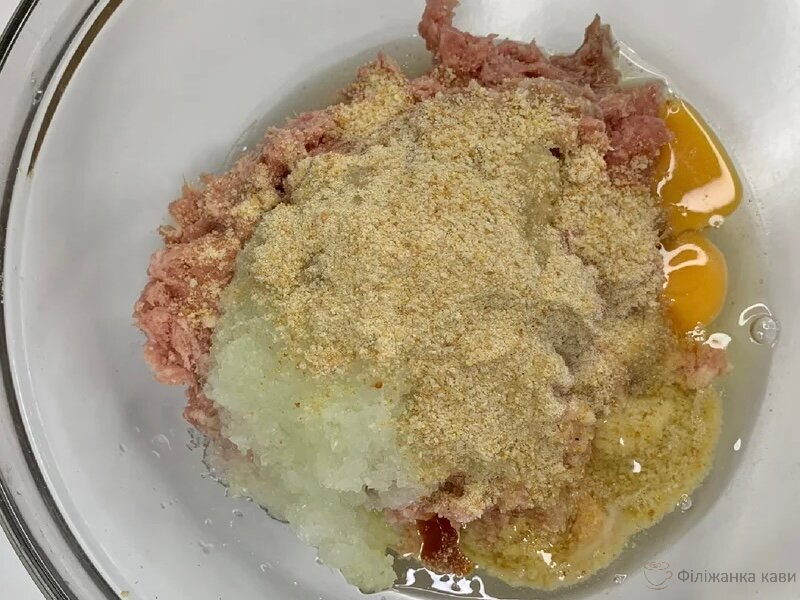 Додаємо в фарш сіль, перець чорний мелений, пропущений через м’ясорубку цибулю, яйце і панірувальні сухарі (можна скибочку хліба додати замість сухарів).