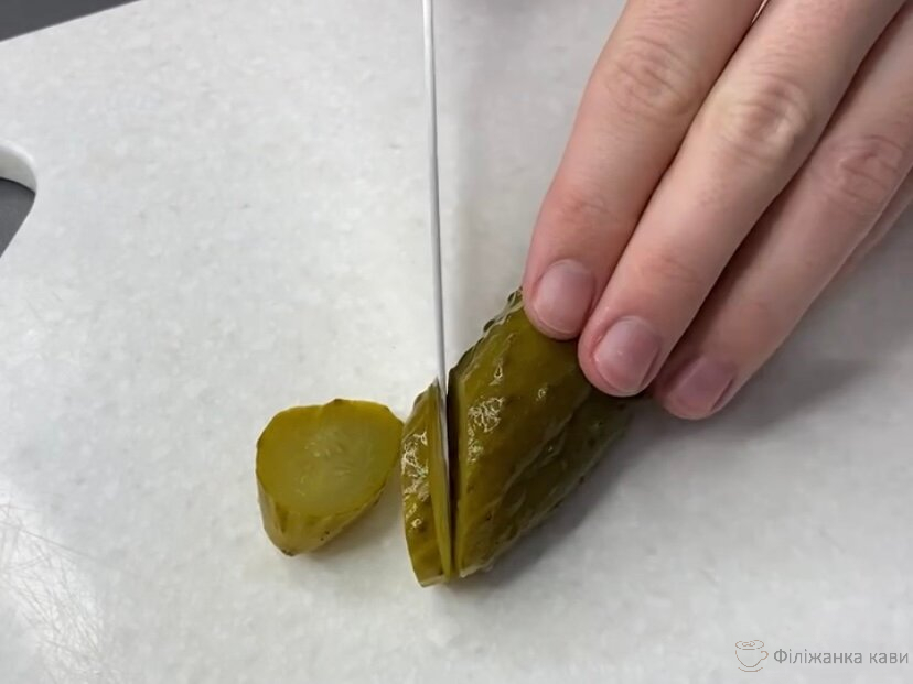 Солоні огірочки, можна і мариновані взяти, нарізаємо дрібними кубиками. Додаємо в фарш.