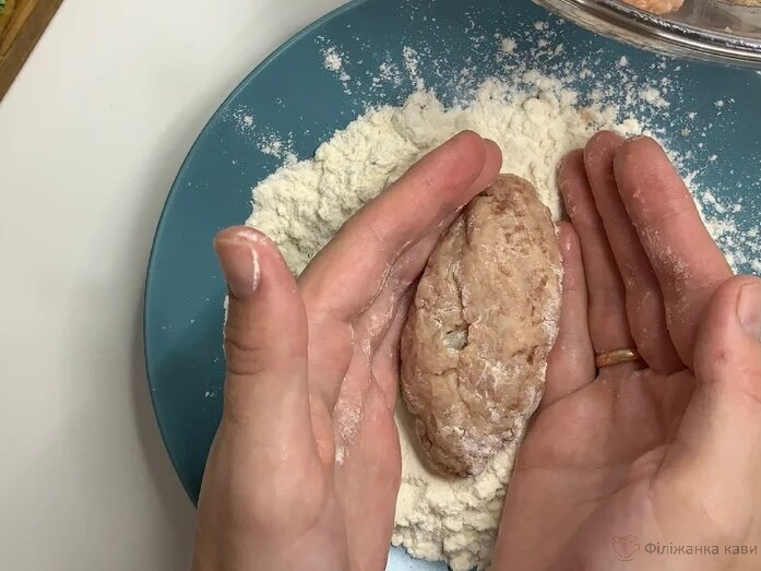 Добре фарш вимішуємо, відбиваємо. Формуємо котлетки, паніруємо в борошні.