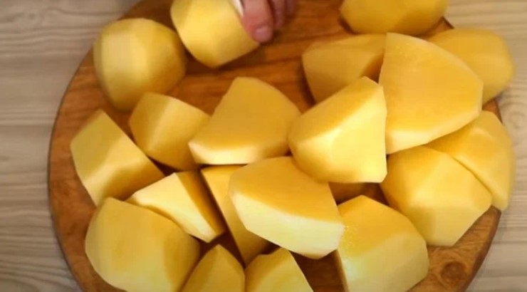 - Картоплю очистимо, кожну бульбу ріжемо на 4 частини, невеликі бульби можна не розрізати.