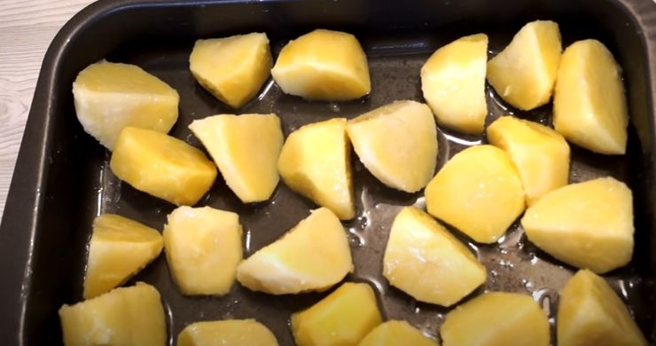 - На деко наливаємо олію, перекладаємо підморожену картоплю, розподіляємо рівномірно по деку, стежачи за тим, щоб вся картопля змастилася олією.