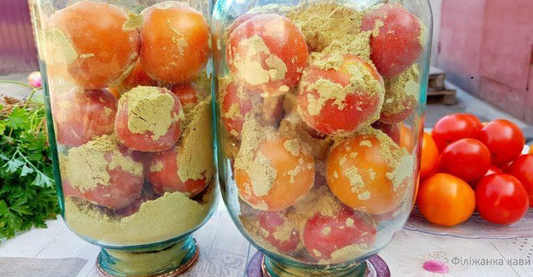 - На дно ємності всипати одну ст. л. гірчиці і укласти помідори, заповнивши половину об’єму. Всипати решту гірчиці і укласти помідори до самого верху.