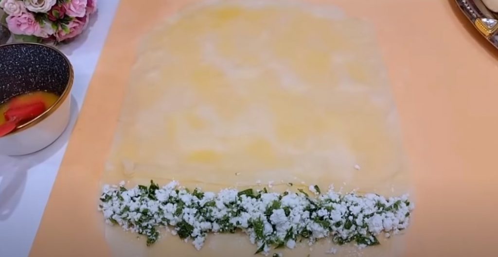 - Викладаємо тонким шаром начинку та згортаємо рулети.