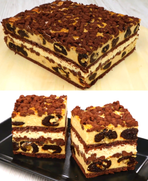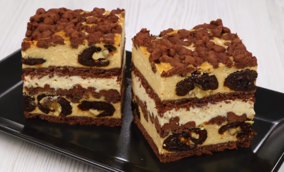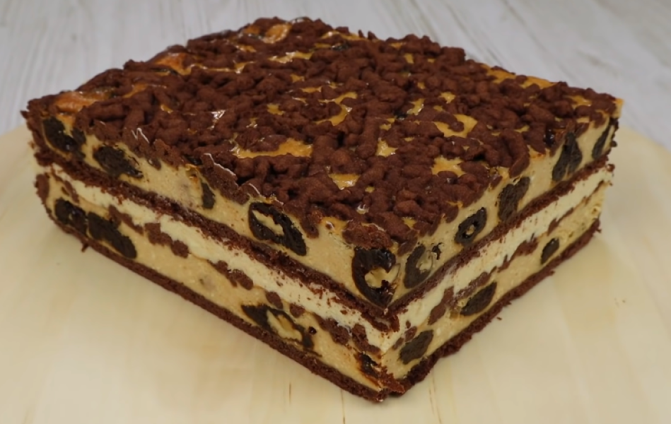 Приготування коржа: 1. Сирна начинка. Сир перемолоти на однорідну масу. Яйця злегка збити, додати крохмаль, варене згущене молоко та перемішати. Додати перемелений сир, вимішати до однорідності. 2. Основа коржа. Змішати борошно з какао, цукровою пудрою та розпушувачем. До суміші додати сметану та масло кімнатної температури, замісити тісто.