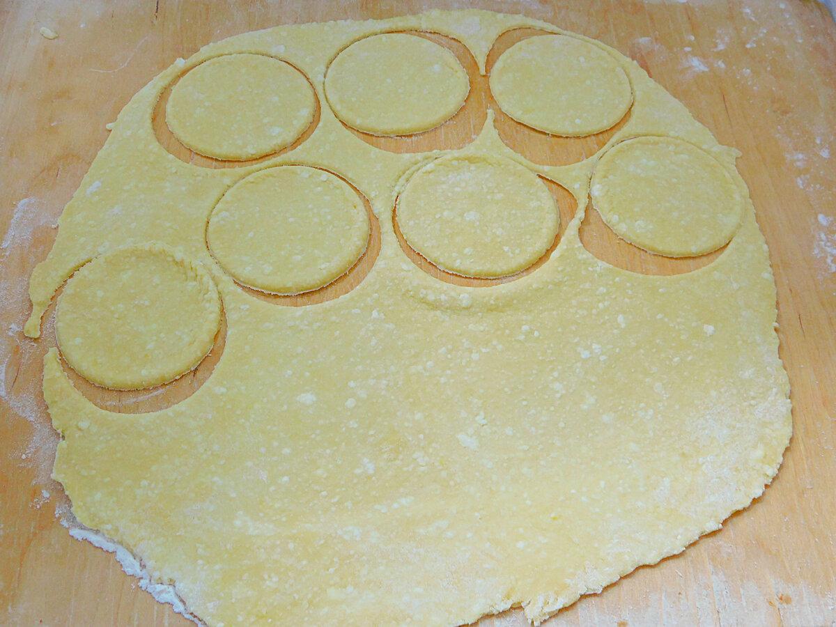 Розкачати в якомога тонший пласт. Склянкою діаметром 6-7 сантиметрів вирізати круглі заготовки.
